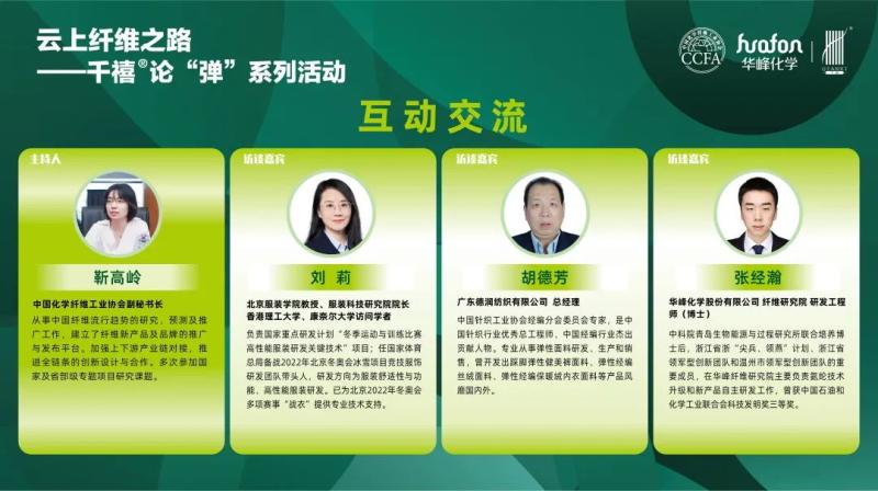 3月29日晚,由中國(guó)化學(xué)纖維工業(yè)協(xié)會(huì)聯(lián)合華峰化學(xué)股份有限公司主辦的云上纖維之路千禧論“彈”系列活動(dòng)第三場(chǎng)——對(duì)話科技冬奧專(zhuān)場(chǎng)在纖維新視界直播間成功舉辦。此次活動(dòng)聚焦冬奧科技,邀請(qǐng)到國(guó)家冬季運(yùn)動(dòng)服裝裝備研發(fā)中心主任、北京服裝學(xué)院教授劉莉,廣東德潤(rùn)紡織有限公司總經(jīng)理胡德芳,華峰化學(xué)股份有限公司纖維研究院研發(fā)工程師張經(jīng)瀚一起暢談纖維科技如何助力高性能運(yùn)動(dòng)服裝,干貨滿滿,線上觀看量超1萬(wàn)次。