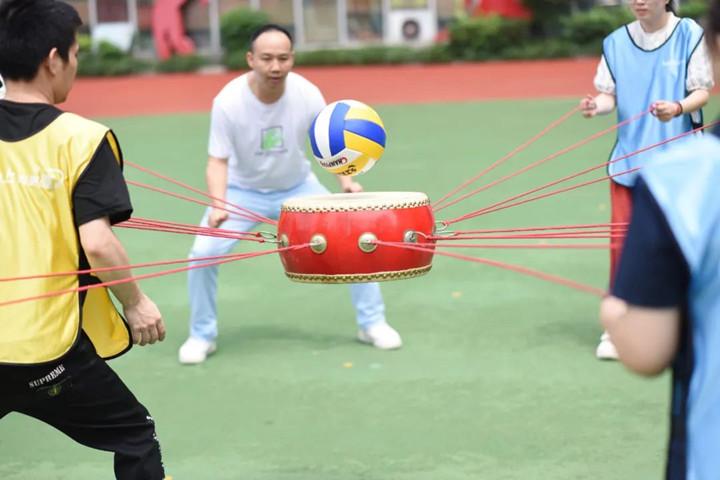 擊鼓顛球區(qū)域,10名隊員圍成一圈,齊心協(xié)力拉動鼓繩,排球在鼓面上歡快地跳躍,大家時而屏息凝神,時而歡呼雀躍,緊張又刺激。