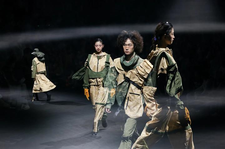 首批入庫品牌發(fā)布之后,一場定位于“未來運動美學全景演繹”的泛運動超級大秀精彩上演。這場大秀匯聚了在首屆“千禧”杯服裝設(shè)計大賽中涌現(xiàn)出的60套優(yōu)秀設(shè)計作品。中國青年設(shè)計力量以多元化的運動項目為載體,融合攀巖、滑雪、徒步、露營、潛水、劍術(shù)等多種戶外體驗,通過前沿材料的創(chuàng)新應(yīng)用,探索運動時尚的全新邊界,展示纖維材料在功能性、舒適性和創(chuàng)意表達上的無限可能。大秀從科技感和極限運動為主調(diào)的戶外探險拉開序幕,到動感與時尚的城市運動系列,再到輕松舒適的山野漫步系列,最后以充滿童趣的溫馨畫面結(jié)尾,也象征著未來的希望。