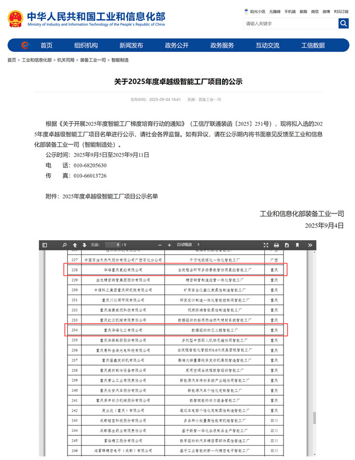 名單可見,重慶華峰化工“數(shù)據(jù)驅(qū)動(dòng)的己二酸智能工廠”和華峰重慶氨綸“全流程全環(huán)節(jié)多場景數(shù)智協(xié)同氨綸智能工廠”成功上榜“卓越級(jí)智能工廠”公示名單;重慶華峰化工“5G全連接工廠項(xiàng)目”雙料入圍“2025年5G工廠”名錄。